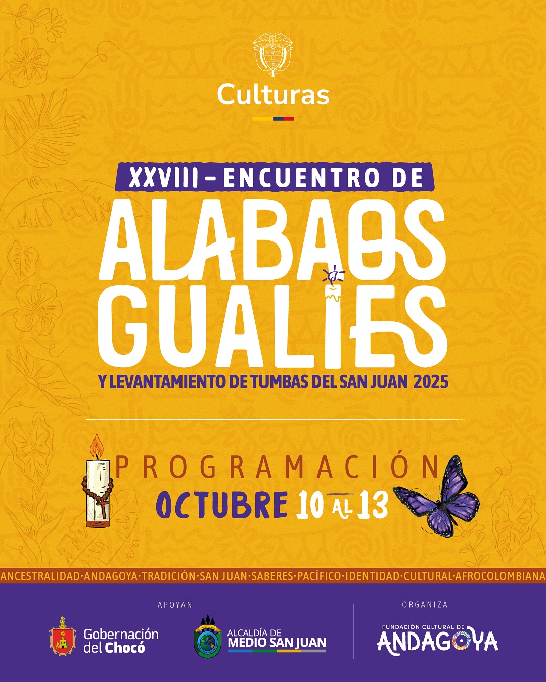 La Fundación Cultural de Andagoya, con el apoyo del Ministerio de las Culturas, Gobernación del Chocó y la Alcaldía de Medio San Juan, invitan a todos los interesados a participar de esta programación que celebra 28 años de cultura viva y resistencia afrocolombiana.